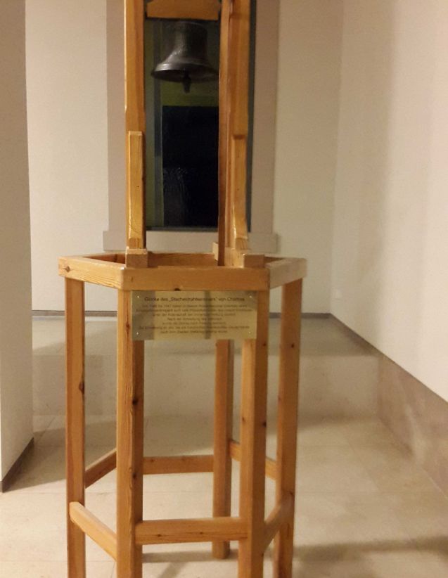 Cette photo représente la cloche qui se trouvait au Séminaire des barbelés pour rythmer les journées. Depuis sa fermeture, en juin 1947, elle se trouve à la faculté de théologie de Fribourg en Allemagne. En effet, ses professeurs venaient au Coudray pour assurer certains cours et valider leurs examens des séminaristes A l'occasion d'une belle et récente exposition sur Franz Stock organisée par le Franz Stock Komitee, la cloche a été mise en valeur et photographiée par la délégation des Amis de Franz Stock qui s’est rendue à Fribourg en vue de renouer des liens avec la faculté de théologie. Rappelons que celle-cii, en décembre 1948, avait accoirdé le titre de Docteur Honoris causa à Franz Stock.