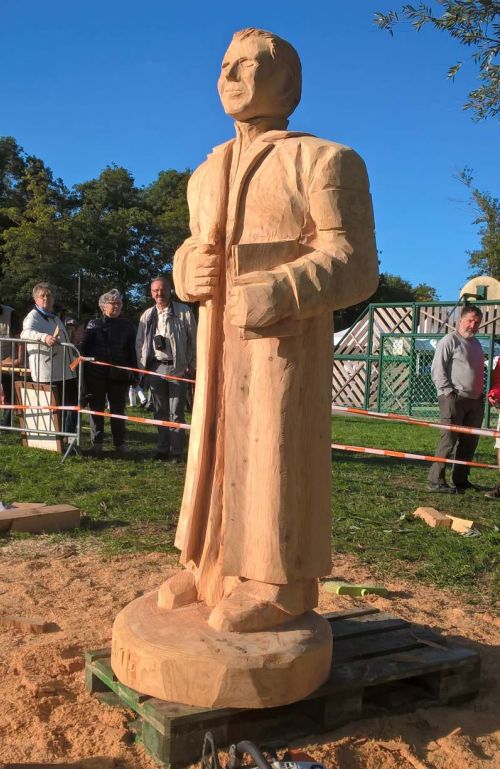 Cette oeuvre prendra place face à l'entrée du Séminaire des barbelés - Centre Européen de Rencontres Franz Stock au camp du Coudray.La statue tirée d'une bille de bois de cèdre de plus de 200 ans, provient d'un ancien presbytère de Coulonges les Sablons dans l'Orne, sera gardée qqs mois à l abri et traitée à l' huile de lin avant sa mise en place à l'extérieur. Elle est presque certainement la première statue de Franz Stock en pied, et tout à fait surement la première statue de celui-ci en bois./.