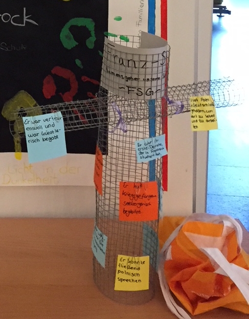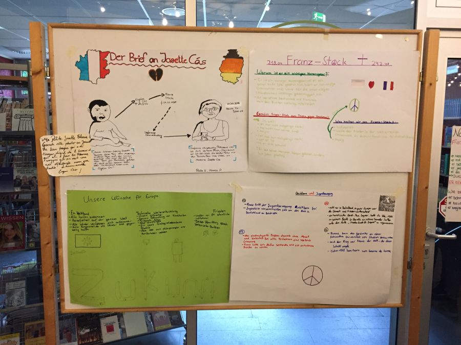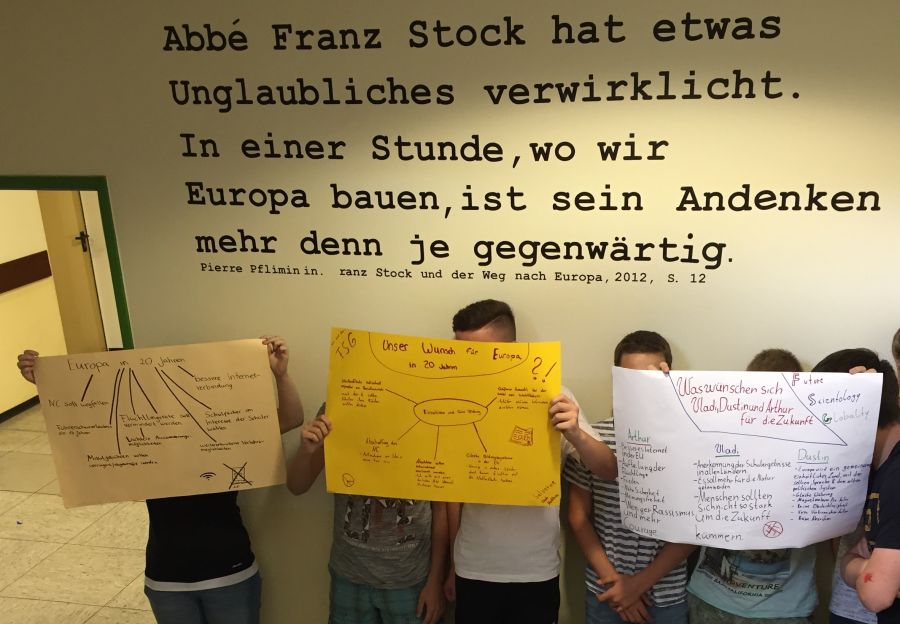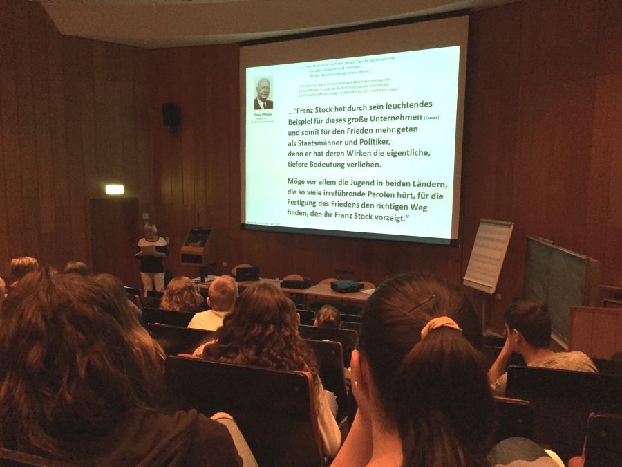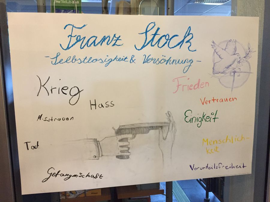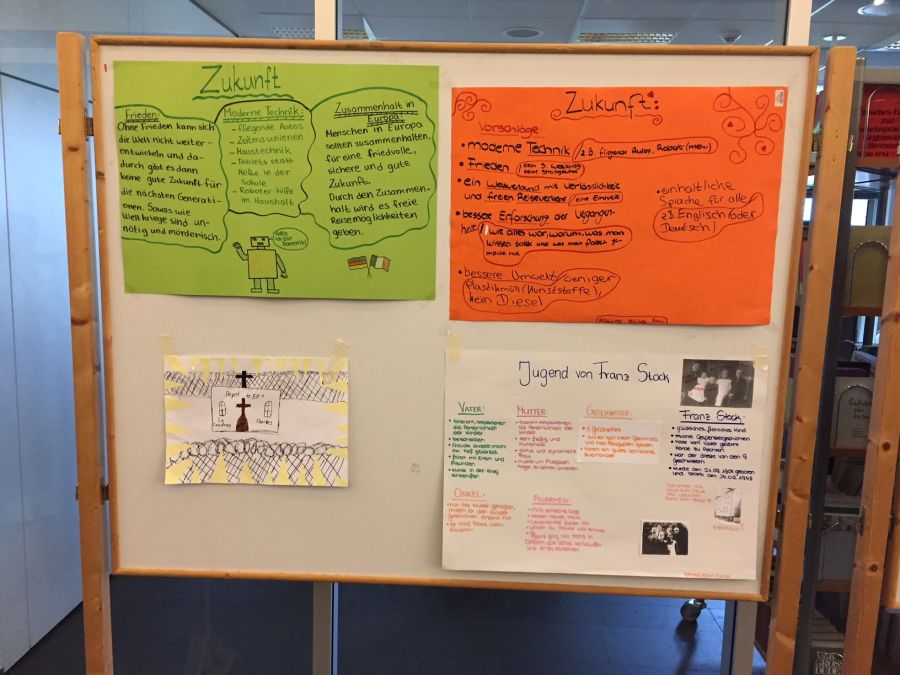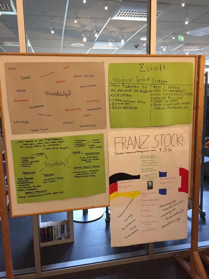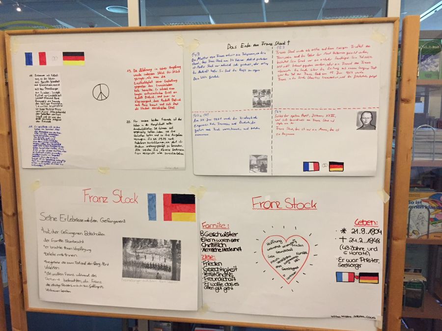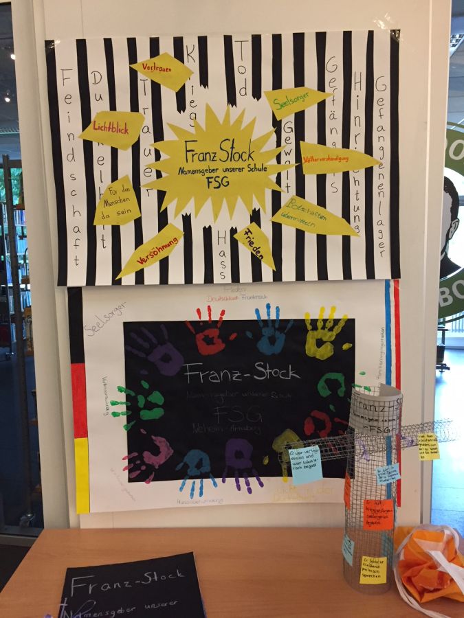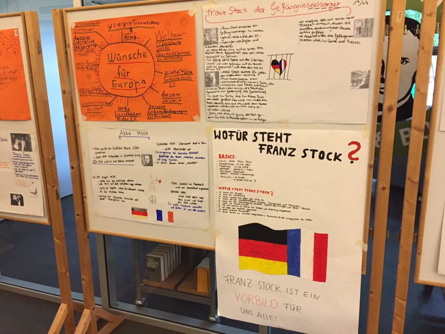 Die Jahrgangsstufen 7 und 8 haben sich am Montag, 9. Juli und am Dienstag 10. Juli jeweils einen ganzen Vormittag mit Franz Stock beschäftigt. Margreth Dennemark vom Franz-Stock-Komitee hielt an beiden Tagen einen Power-Point-Vortrag mit dem Thema: "Franz Stock - Namensgeber meiner Schule". Danach begannen die Projektarbeiten in mehreren Gruppen mit unterschiedlichen Aufgabenstellungen: "Franz Stock und sein Leben", "Was denken SchülerInnen über die deutsch-französische Freundschaft" "Was denken SchülerInnen über den Namensgeber ihrer Schule" und "Wie wird Europa in 20 Jahren aussehen? Was wünschen sich SchülerInnen für ihre eigene Zukunft von Europa?".