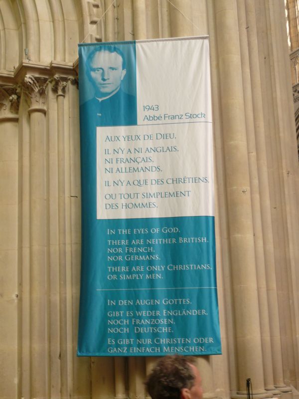 Fast im ganzen Jahr 2014 wird zwischen den Pfeilern des Mittelschiffes der Kathedrale von Bayeux ein großes Banner hängen mit dem Bild von Franz Stock und seinem Zitat: „In den Augen Gottes gibt es weder Engländer, noch Franzosen, noch Deutsche, es gibt nur Christen oder ganz einfach Menschen."