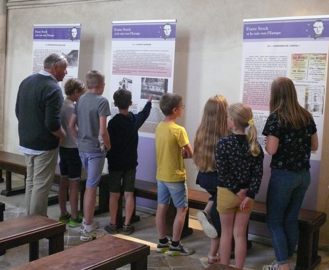 Dans ce lieu de prière consacrée à Notre Dame de la Paix, les 16 panneaux évoquant la vie et l’œuvre de Franz Stock offraient un contrepoint aux images de guerre présentées dans les musées. Un enfant, présent à l’inauguration de l’exposition, en a parlé à son maître d’école qui a aussitôt organisé une visite commentée pour ses deux classes de CM1 et CM2 – une cinquantaine d’enfants en tout. Au cours de leur déambulation, de nombreux adultes se sont attardés sur certains panneaux, l’enfance de Stock et bien sûr l’épisode du Mont Valérien et la création du Séminaire des Barbelés.