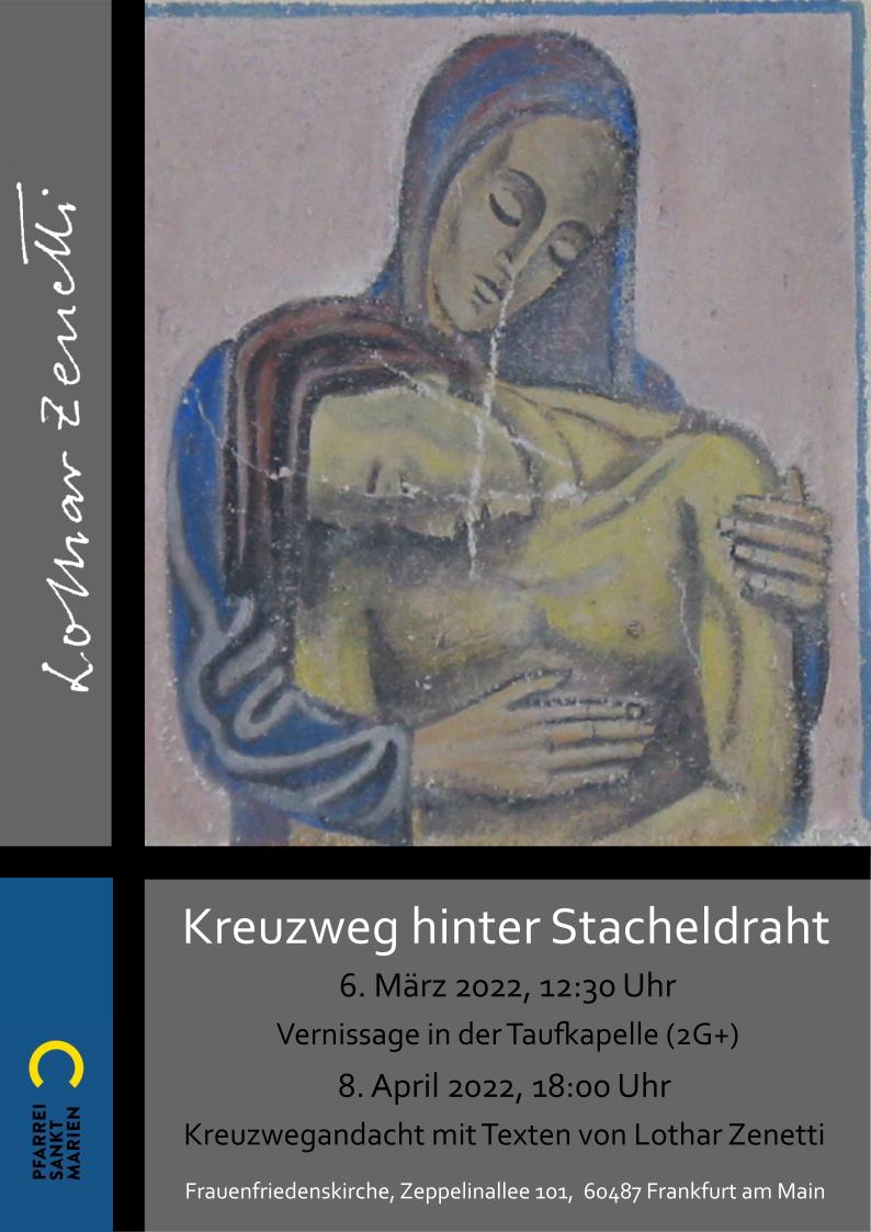 Wir freuen uns, dass Reproduktionen der Kreuzwegstationen zukünftig dauerhaft in der Taufkapelle der Frauenfriedenskirche in Frankfurt-Bockenheim zu sehen sein werden. Es war die Heimatgemeinde von Lothar Zenetti. Eine Vernissage ist am 6. März 2022, 12.30 Uhr