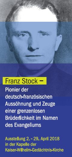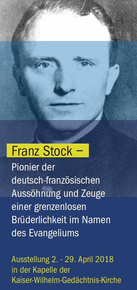Vom 02.-29.04.2018 wird die neue Franz-Stock-Wanderausstellung in der Kapelle der evangelischen Kaiser-Wilhelm-Gedächtnis-Kirche, Breitscheidplatz, 10789 Berlin gezeigt. Die Ausstellung wird hier um verschiedene Elemente ergänzt. Öffnungszeiten: täglich 13.00 bis 19.00 Uhr. Am Sonntag 1. April 2018, 18:00 wird die Ausstellung mit einem Gottesdienst eröffnet.