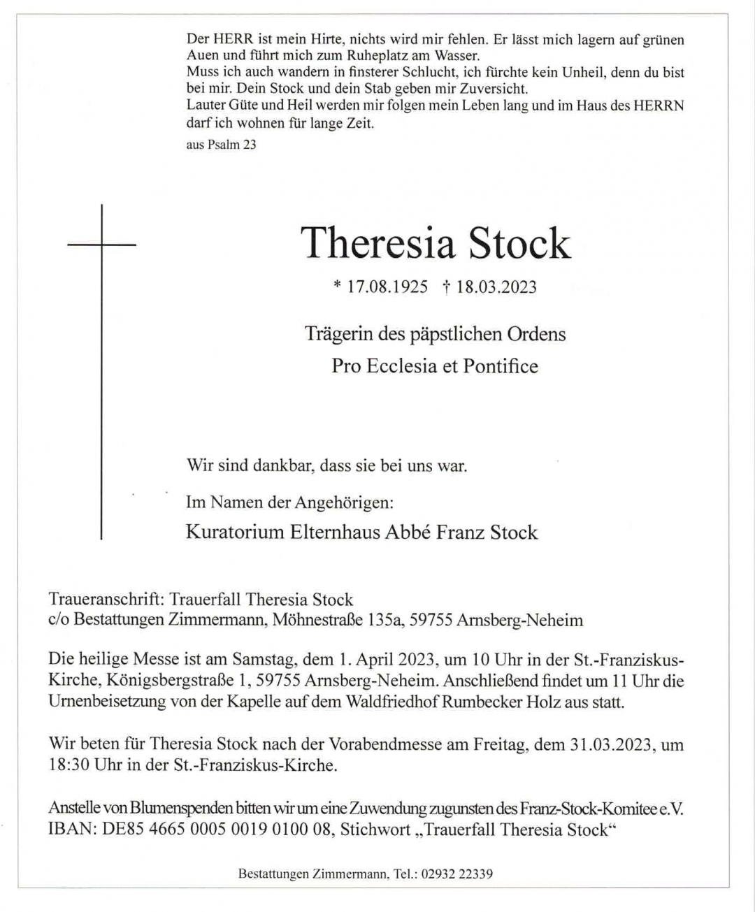 En 1997, elle convertit la maison de ses parents en "Mémorial et Centre de Rencontre de l'Abbé Franz Stock". Pendant de nombreuses années, elle a été la force motrice du « conseil d'administration de la maison parentale ». Elle y accueillait de nombreux visiteurs. Très vive et dotée d'une grande empathie, elle a su leur raconter le quotidien de son frère. Pour Theresia Stock, cela faisait aussi partie de sa propre vie.