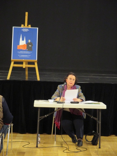 Marie-José Robert a évoqué la grande figure de Franz Stock, qui appartient à l’histoire de Suresnes et du Mont-Valérien, devant un public déjà fort sensibilisé à sa cause et qui se souvient des atrocités commises par les nazis au Fort du Mont-Valérien. Elle a rappelé la journée du 15 septembre 1990, date de l’inauguration de la Place de l’Abbé Franz Stock devant le Monument de la France Combattante et lu la lettre que le Chancelier Helmut Kohl avait adressée à notre Maire, le 18 décembre 1990, pour le remercier. La dernière partie de ses propos a été consacrée à la mission de Franz Stock au Séminaire des Barbelés. L’exposition Franz Stock à Strasbourg, dans la première quinzaine de Mai mai prochain, placée sous le haut patronage de Monsieur Martin Schulz a aussi été annoncée.