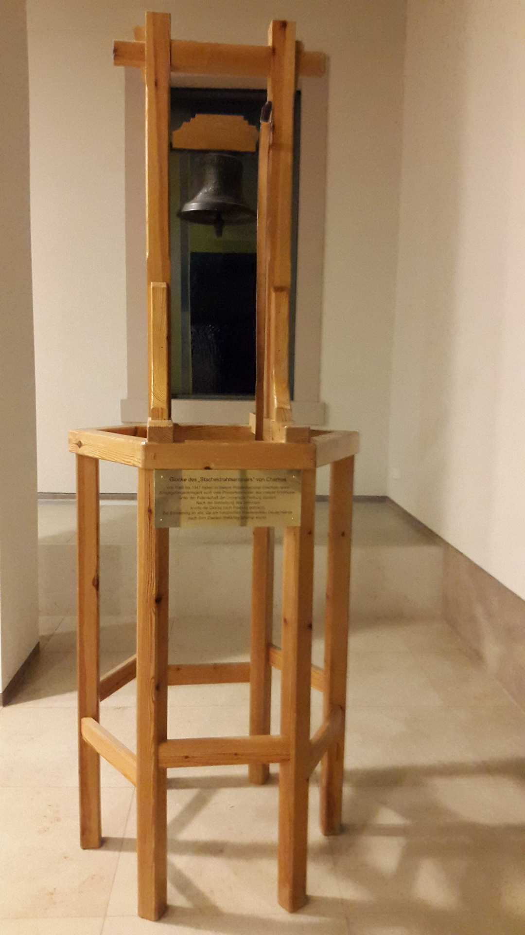 Cette photo représente la cloche qui se trouvait au Séminaire des barbelés pour rythmer les journées. Depuis sa fermeture, en juin 1947, elle se trouve à la faculté de théologie de Fribourg en Allemagne. En effet, ses professeurs venaient au Coudray pour assurer certains cours et valider leurs examens des séminaristes A l'occasion d'une belle et récente exposition sur Franz Stock organisée par le Franz Stock Komitee, la cloche a été mise en valeur et photographiée par la délégation des Amis de Franz Stock qui s’est rendue à Fribourg en vue de renouer des liens avec la faculté de théologie. Rappelons que celle-cii, en décembre 1948, avait accoirdé le titre de Docteur Honoris causa à Franz Stock.