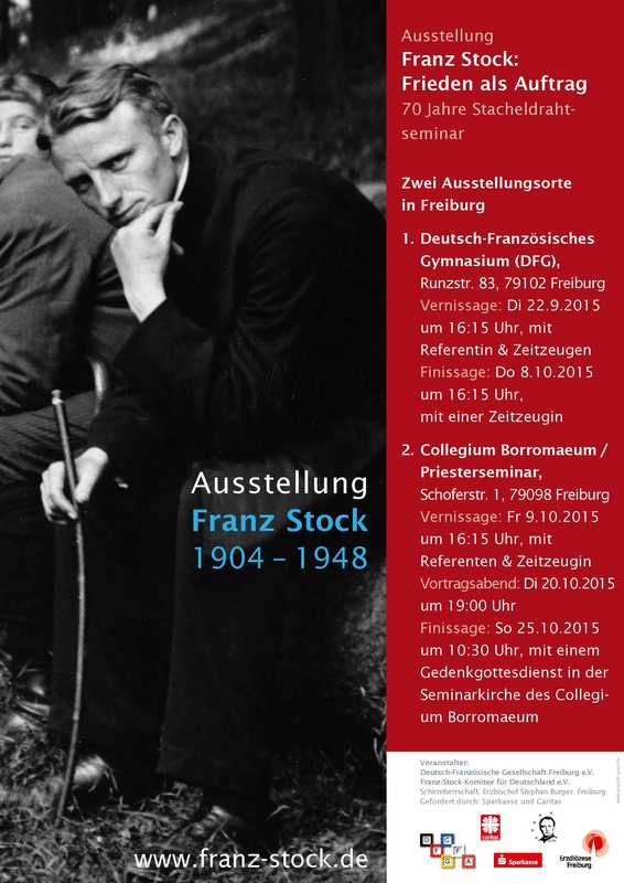 Unsere Wanderausstellung "Franz Stock - Frieden als Auftrag" wird von der Deutsch-Französischen Gesellschaft Freiburg im Breisgau vom 22.09. bis 08.10.2015 im Deutsch-Französischen Gymnasium (Runzstr. 83, 79102 Freiburg) und vom 09.10. bis 25.10.2015 im erzbischöflichen Priesterseminar Collegium Borromaeum (Schoferstr. 1, 79098 Freiburg) gezeigt. Wir freuen uns, dass Erzbischof Stephan Burger die Schirmherrschaft über die Ausstellung in Freiburg übernommen hat. Weitere Informationen: http://www.franz-stock.org/index.php?option=com_content&view=article&id=867:wanderausstellung-in-freiburg-2015&catid=40&Itemid=603&lang=de