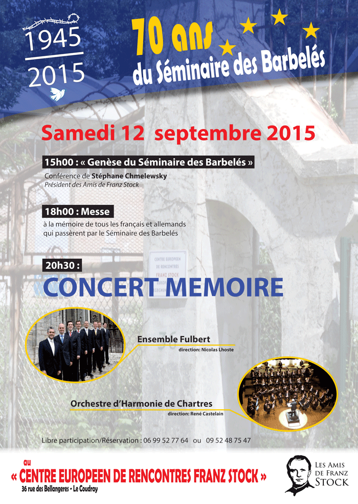 Vor 70 Jahren wurde das sog. „Stacheldrahtseminar“ in Le Coudray bei Chartres gegründet. Franz Stock stand bis zu dessen Auflösung 1947 als Regens diesem Seminar vor. In den kommenden zwei Jahren werden aus diesem Anlass verschiedene Veranstaltungen vorbereitet. Am Samstag, dem 12. September 2015, sind in Charters mehrere Veranstaltungen mit einem abendlichen ein Konzert geplant. Das Franz-Stock-Komitee möchte aus diesem Anlass zwischen dem Fr., 11. und Mo., 14. September eine Busfahrt nach Chartres anbieten. Weitere Informationen auf unserer Homepage: