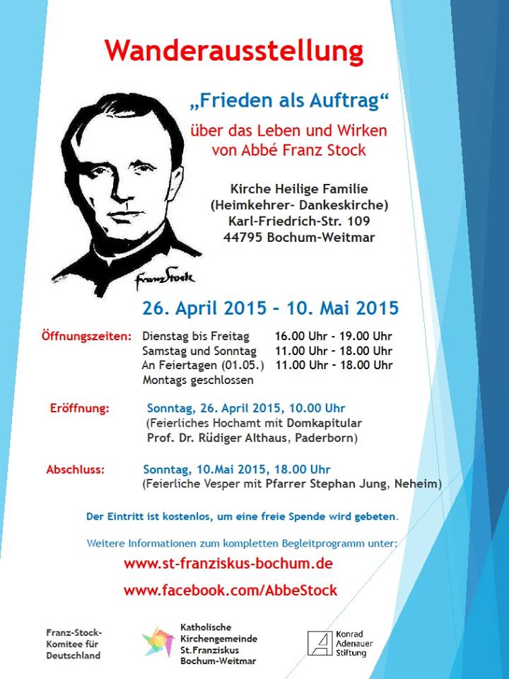 Bereits jetzt möchten wir auf den Termin unserer Wanderausstellung "Franz Stock - Frieden als Auftrag" in Bochum mit einer Vielzahl von Vorträgen und Einzelveranstaltungen aufmerksam machen. Die Ausstellung wird vom 26. April - 10. Mai 2015 in der Kirche Heilige Familie (Heimkehrer-Dankeskirche) Bochum-Weitmar präsentiert. Ein breites Begleitprogramm richtet sich besonders auch an Schüler. So referieren u.a. Bischof Dr. Wiesemann (Speyer) am 21.4. und Ministerpräsident a. D. Dr. Jürgen Rüttgers am 9. Mai. Die Zeitzeugin Helga Walbaum (Paris) spricht am 28.4. in der Europaschule Neues Gymnasium Bochum und auch Bischof Michel Pansard (Chartres) ist am 2. u. 3. 5. in Bochum. Unser Komitee ist durch Thomas Bertram am 29. u. 30.5. (Schulaktionstage) sowie am 7.5. (Vortrag), Margreth Dennemark am 09.05. (Französischer Chanson-Abend mit Georg Marekwica) und durch Pfarrer Jung am 10.5. (Abschlußvesper) vertreten.