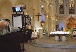 In den Tagen zuvor hatte das rund 25-köpfige Team des Mainzer Senders die frisch renovierte Kirche zwar nicht gerade in ein Fernsehstudio verwandelt, aber sie schon für die Übertragung vorbereitet: Scheinwerfer wurden installiert oder Podeste für die Sängerinnen und Sänger des Kirchenchores aufgebaut.