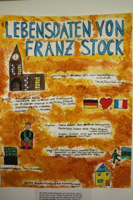 Die Einzel- oder Gruppenarbeiten der Schülerinnen und Schüler aus den verschiedenen Jahrgangsstufen beinhalten künstlerische Gestaltungsformen wie Bilder, Drucke, Plastiken, Collagen oder Videos sowie Tanz, Hörspiel- und Musikinterpretationen. Darüber hinaus wurde das Leben und Wirken Franz Stocks in selbst verfassten und illustrierten Kinderbüchern, zum Teil zweisprachig in Französisch und Deutsch, umgesetzt.