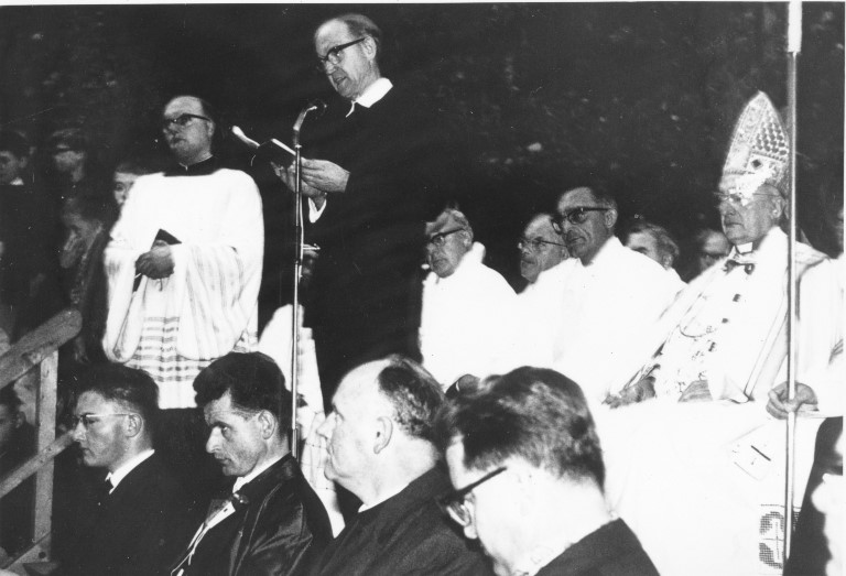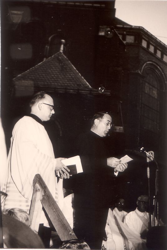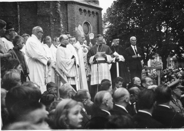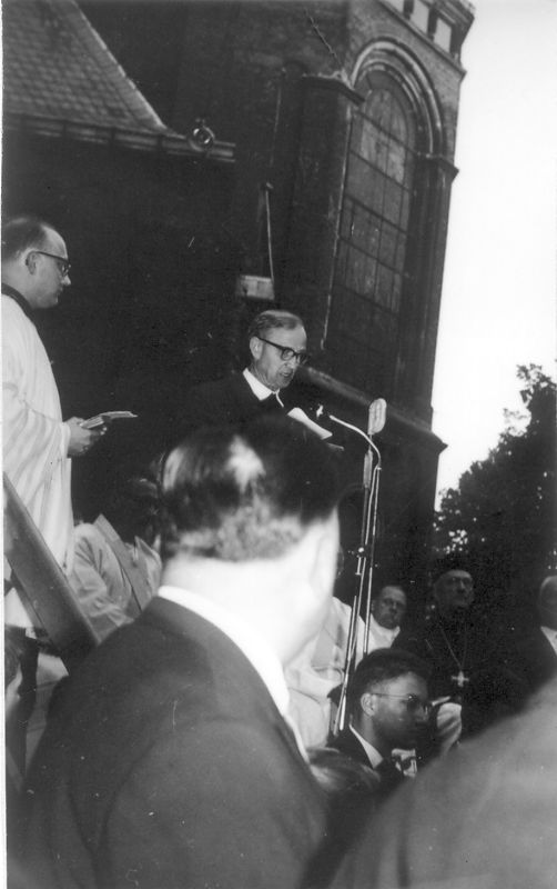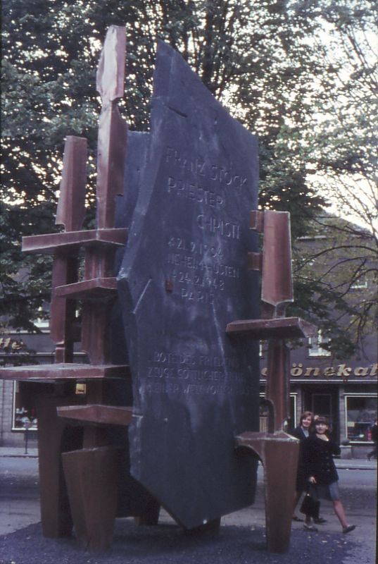 Um 17.30 Uhr versammelte sich eine große Volksmenge beim Denkmal vor der Kirche St. Johannes. In seinem Grußwort würdigte Kardinal Jaeger das Leben Franz Stocks. Er schrieb: „Ganz erfüllt von seiner priesterlichen Aufgabe lebte er das Wort des Völkerapostels: Ich bin beauftragt mit der Verkündigung der Frohbotschaft von der Herrlichkeit der Liebe Gottes (1. Tim. II).“ Oberstleutnant Gourut sprach für die französischen Teilnehmer: „Ich frage euch, warum ihr vielleicht erstaunt seid über so viele Feiern zu Ehren Franz Stocks. Er war die Liebe, die keine Völkergrenzen kennt . . . er war der Halt, der Trost der Armen . . . Weil sein Lebenswerk unvollendet geblieben ist, darum steht dieses Denkmal auf diesemPlatz; damit die junge Generation den Appell vernehmen kann, den er an sie richtet.“ Pfarrer Allroggen deutete die Aussage des Denkmals: „Es sprengt in seiner Gestaltung den Rahmen des ÜbIichen“, aber darin sei es Ausdruck des Lebens und Werkes Franz Stocks und seines Auftrags an uns.