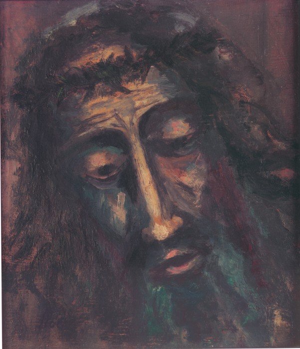 Das kleinformatige, aber sehr eindringliche Bild zeigt schemenhaft den Kopf des „Schmerzensmannes", frontal und in leidvoller Emotion seitlich geneigt. Seine Konturen verschmelzen beinahe mit dem düsteren Hintergrund. Es ist vor allem das Gesicht, das durch auffallende Hell-Dunkel-Effekte besticht. Das Licht für dieses Leuchten scheint von innen zu kommen. Die dunklen Linien der Augenbrauen und der schmalen langen Nase lassen den idealisierenden Duktus aufscheinen, der von der Ikonenmalerei bekannt ist, ebenso wie auch das feingeschnittene Antlitz. Doch dieses Antlitz ist ausgezehrt, und anders als bei einer Ikone schaut Jesus den Betrachter auch nicht an aus einer überirdischen Ferne. Hier sehen wir den Menschensohn sehr menschlich in seinem furchtbaren inneren Leiden, im Bewusstsein seines bevorstehenden Opfertodes. Seine Augen in den dunklen Augenhöhlen sind geöffnet, richten aber den Blick nicht um Hilfe nach oben, sondern nach unten, gleichsam nach innen, um innere stumme Zwiesprache zu halten. Das suggeriert auch der kleine leicht geöffnete Mund, der keinen Schrei ausstößt, sondern eher zu sich selbst spricht: „Ich tue es für Euch!", „Vater, wo bist du?", „Dein Wille geschehe!" ... Es sind die Worte des Gottmenschen, der sich seiner Situation voll bewusst ist und sich ihr bedingungslos stellt. Seine Schmerzen sind denn auch in diesem Bild weniger auf äußere, leibliche Pein zurückzuführen als vielmehr auf die seelische Qual und eine große, tiefe Traurigkeit und Verlassenheit: sein Leiden an den Menschen und um die Menschen. Auch die Dornenkrone wird eher angedeutet wie der Lorbeerkranz eines Siegers denn als stacheliges Marterwerkzeug, wie häufig in der Kunstgeschichte zu sehen ist, etwa bei Matthias Grünewald. Diese Dornenkrone ist allerdings das Attribut, das die konkrete biblische Situation Jesu kenntlich macht.